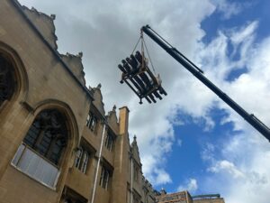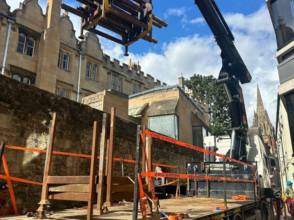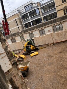 No vehicular access was allowed to the site, with entry limited to a 1.5m wide, 2.2m tall archway. This required navigating over a 4.3m tall Grade I listed wall. Due to these access restrictions, the excavator had to be dismantled, lifted over, and reassembled onsite. The process was carefully coordinated with the client, excavator supplier, and our transport division, with trial lifts conducted at the head office yard.