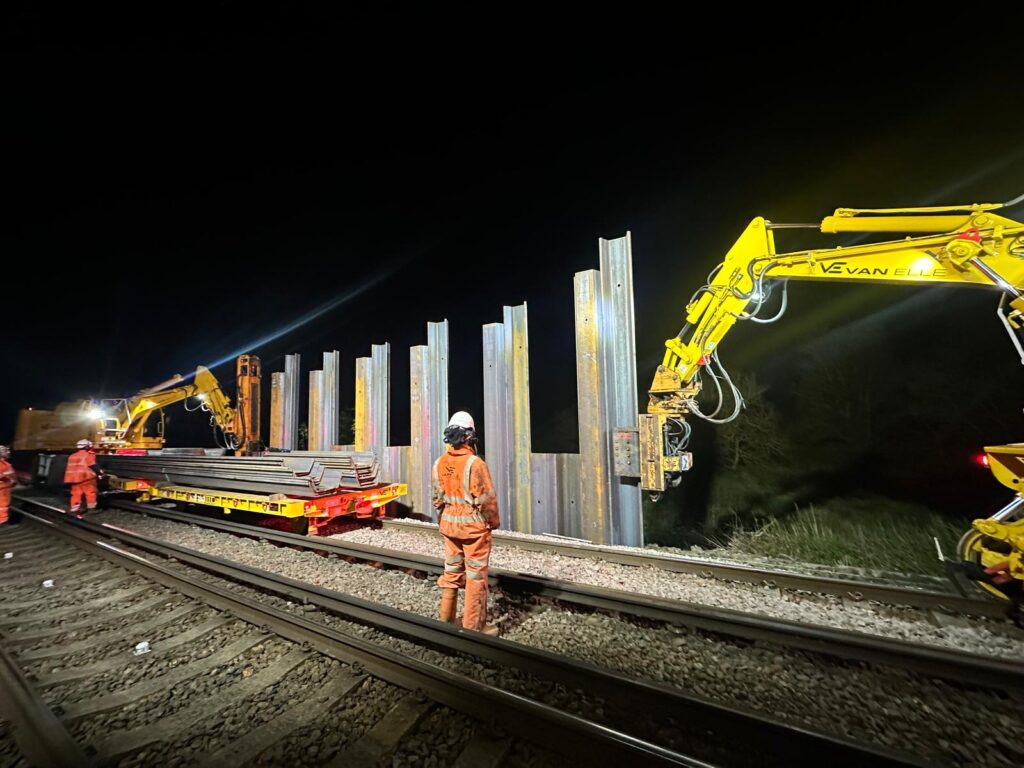 Hardened ground conditions around the culvert required pre-auguring at all 11m sheet pile clutch locations along a 44-metre stretch of embankment to accommodate the piling process. The sheet piling works also presented a logistical challenge, as installation had to be completed within a 100-hour blockade.